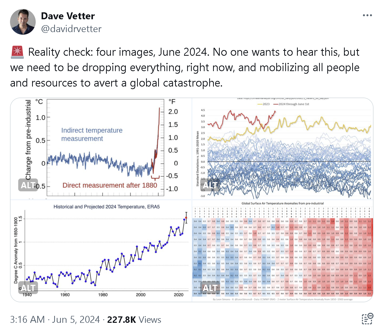 I was reminded of this calculus earlier this month, when I made an impassioned climate post on The Website No One Calls X. Dropping in some well-known charts showing CO2 and temperature increases across a range of timescales, I tweeted: “Reality check: four images, June 2024. No one wants to hear this, but we need to be dropping everything, right now, and mobilizing all people and resources to avert a global catastrophe.”